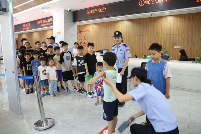 在立案大厅安检处,执勤法警向小朋友演示了安检的工作流程,然后介绍各种安检设备在日常工作中的作用以及禁止携带入院的违禁品,使孩子们切实感受到了安检的重要性与必要性。