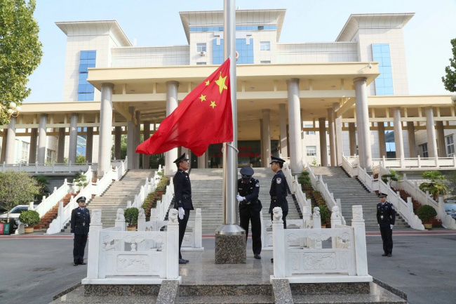鲜艳的五星红旗在晨风中冉冉升起,干警整齐列队、肃穆而立,以昂扬向上的精神风貌,共赴这场与国旗的“秋日之约”。