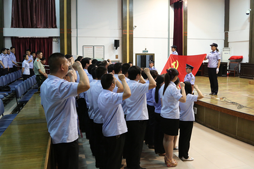 “我志愿加入中国共产党,拥护党的纲领,遵守党的章程,履行党员义务,执行党的决定……”6月15日上午,中牟县人民法院党组书记、院长王炅带领全体党员干警,面对党旗,重温入党誓词。一声声铿锵有力的入党誓词响彻审判庭,全体党员干警热血沸腾,受到震撼和洗礼。